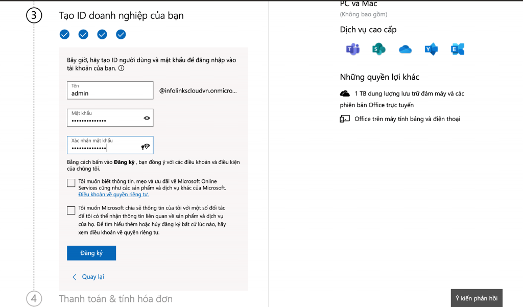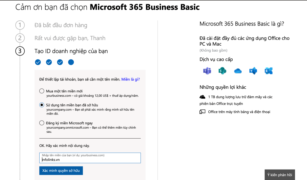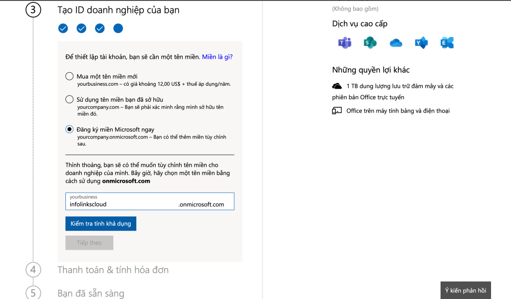 Nếu không hãy chọn một tên miền phụ dạng tencongty@onmicrosoft.com, bạn có thể tuỳ chỉnh lại theo tên miền riêng của bạn sau.
