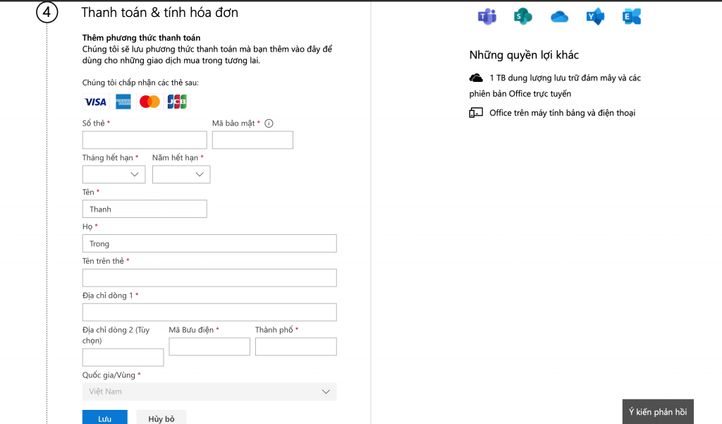 Hãy chuẩn bị một thẻ Visa/Master đủ điều kiện và nhập vào thông tin thẻ ở bước này. Hãy nhớ, bạn có thể thay đổi phương thức thanh toán khác sau khi hoàn thành thiết lập, ngoài ra bạn cũng có thể huỷ đăng ký trong thời gian dùng thử để không bị tính phí sau khi hết hạn dùng thử.